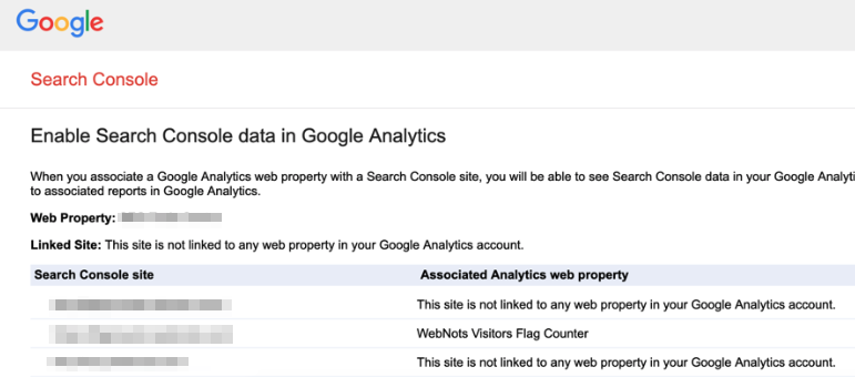 5. You can explore all the possible properties in your Search Console account. Here is a view for the Search Console property of a similar site. Assure that the property is not already connected to any of the existing Analytics accounts. If you’ve somehow connected the wrong property, then the current integration will be removed. This means that you can only link one Search Console property to one Analytics account.