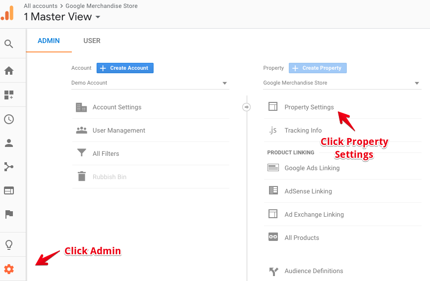 Sign in to your Google Analytics account and scoot over to the ‘Admin’ tab. Choose the site account you want to connect and pick the ‘Property’ you want to assign the data.