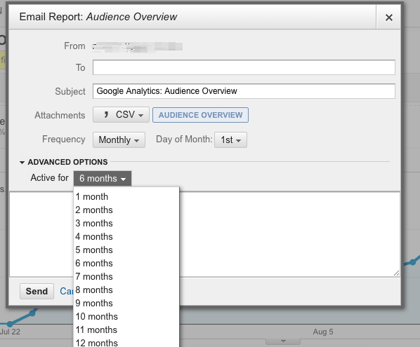 Once you click on the email button a pop up window will appear showing email settings. For sending email reports, the email with which you have created GA account will be used and you can not change it. Enter the recipient email and from the frequency drop down select monthly and also select the day on which you want to send the email.