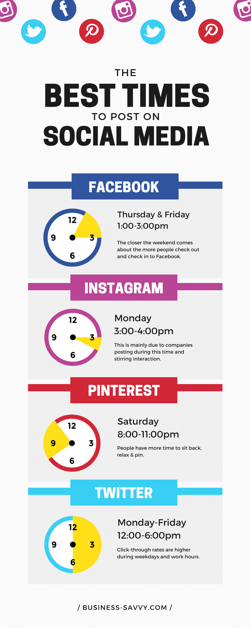 In much the same way, you can also directly share your content on your preferred social media platforms, however, that will need to be strategically timed to produce the maximum effect. The infographic on the left shows the best times to post on certain social platforms.