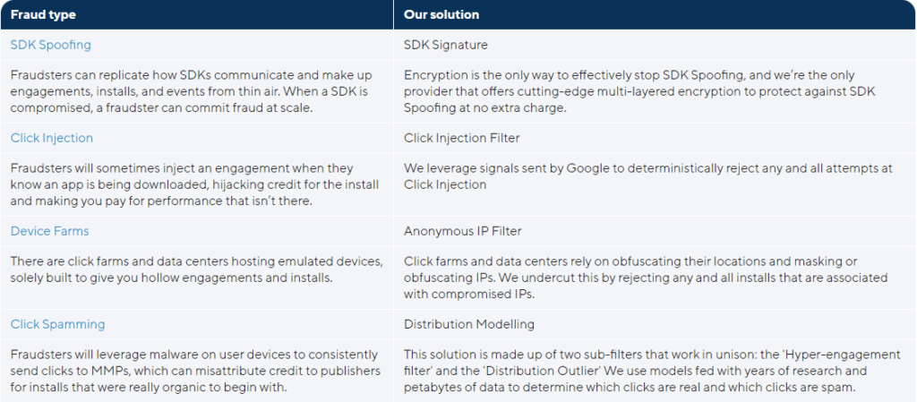 Adjust focuses on mobile attribution. It provides insights into ad clicks, in-app events, and more. They also offer several protective features that might make a big difference for businesses that pay close attention to that.