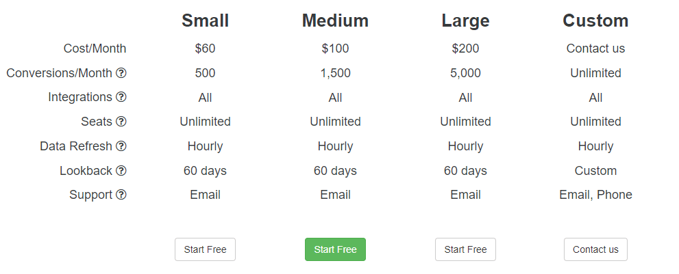 Pricing plans are based on how many conversion events you track per month. In the photo below, you can see the differentiations between plans.