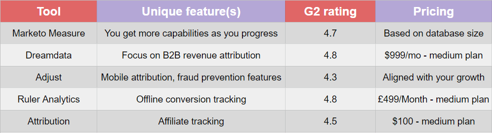 The competition among revenue attribution tools is high, but in the end, considering multiple factors (mostly unique features and functionalities), I came up with this list: