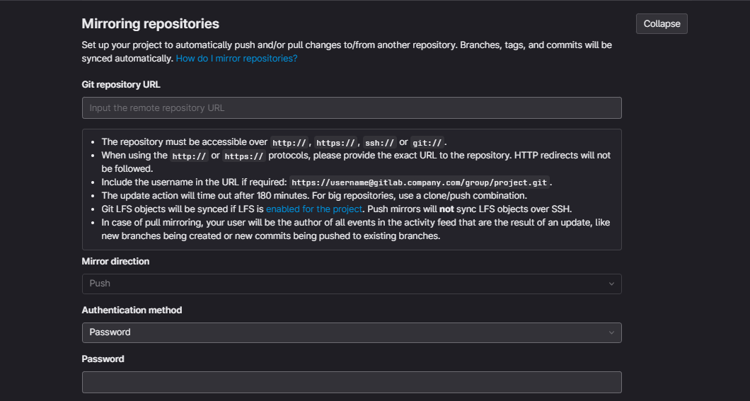 - Here, you need to paste the URL in the Git repository URL field. Paste the Password in the Password field. For all the other options, you can go with default settings like Mirror direction as Push and keeping the checkboxes unchecked.