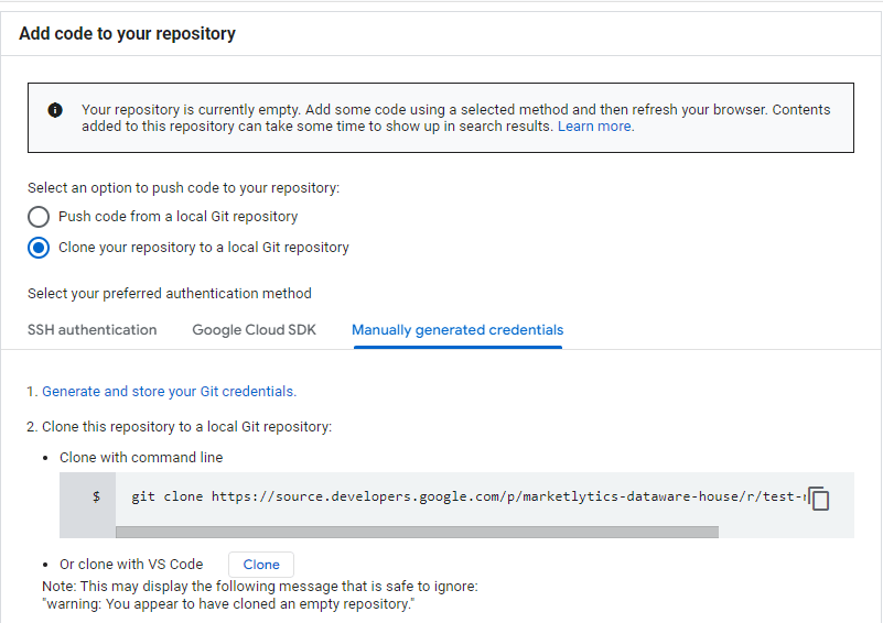 3. Check the box for Clone your Git repository to a local Git repository, open the Manually generated credentials tab. Click on Generate and store your Git credentials.