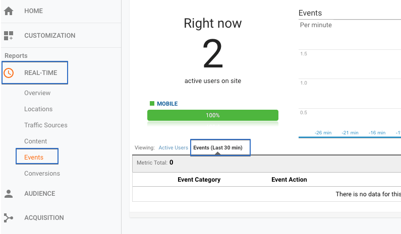 You can look at the real-time reports in google analytics and go to events and look at last 30 mins.