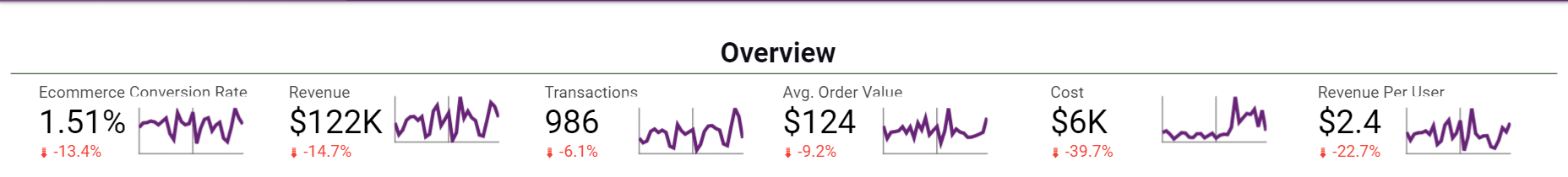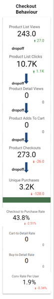 - Product Detail Drop % = (Product Detail Views – Product Adds To Cart) / Product Detail Views