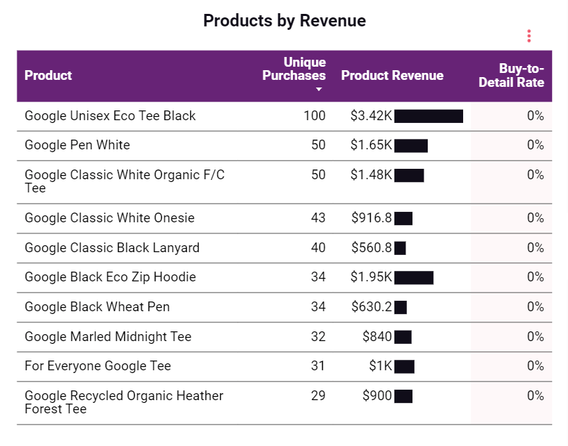 This report displays the top revenue generating products. Click on the dimension or any of the metrics to sort them in ascending or descending order.