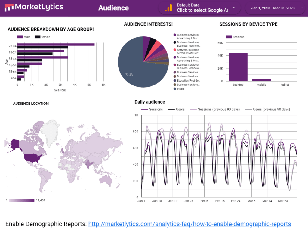 This dashboard displays where in the world your audience lives. It is basically a combination of audience location, gender, and interests reports. Being a content marketer you would be interested to know about your audience and create content around their interest.