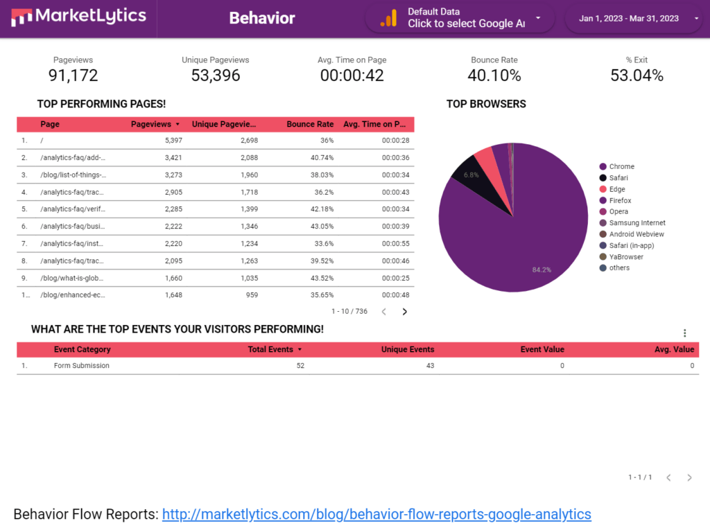 Are you able to impress your website visitors? Do they stay longer and interact with your content? These are really important questions that conclude your business success. This dashboard displays the top performing pages, the top events, and browsers which your visitors use to access your website.