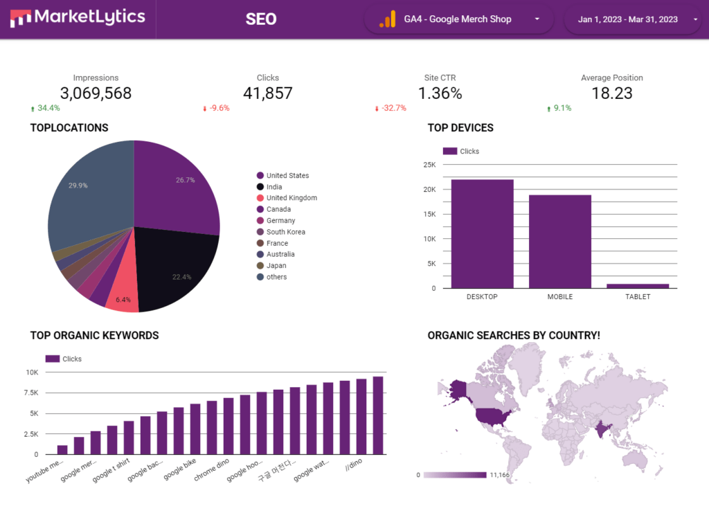 The Looker Studio template is an all in one marketing and SEO template which includes the most important metrics related to your business. Get a glance of your marketing KPIs without having to login to your Google Analytics account.