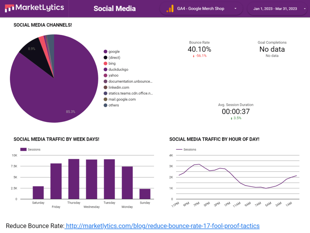Social media alone is a powerful traffic source for your business. It can lift your online business if managed successfully. In this template, you will be able to see the top social media channels, social media visitors behavior, bounce rate, peak days and hours.