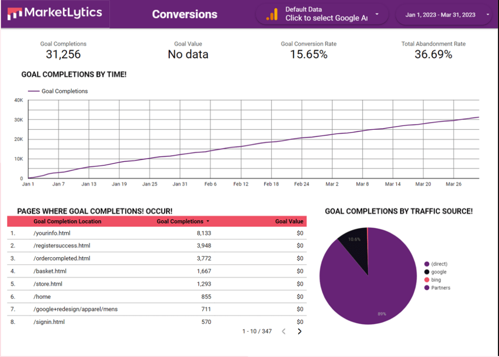 The success of your online business can be measured by the number of goal completions. It can be a pdf download, newsletter sign up, or a form submission. This dashboard will help you have a look at important goal conversions and which traffic sources play an important part in goal completions.