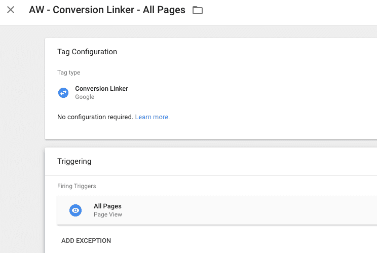 Now, with the new update, you have to add the conversion linker tag also. To do this, create a new tag, select the tag type as conversion tag and set all pages trigger.