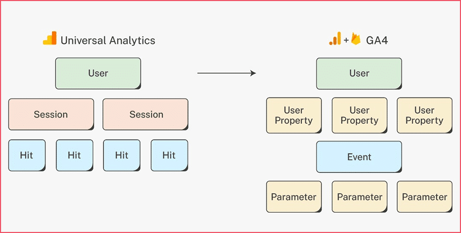 - Event-Based Data Model: UA was based on both page views and events, whereas GA4 is entirely based on events. Every action in GA4 is considered an event, including page views.