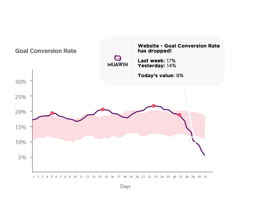 Muawin reads your metrics and dimensions in Analytics Platforms and finds trends that deviate from the norm and ensure your data is accurate and trustworthy.